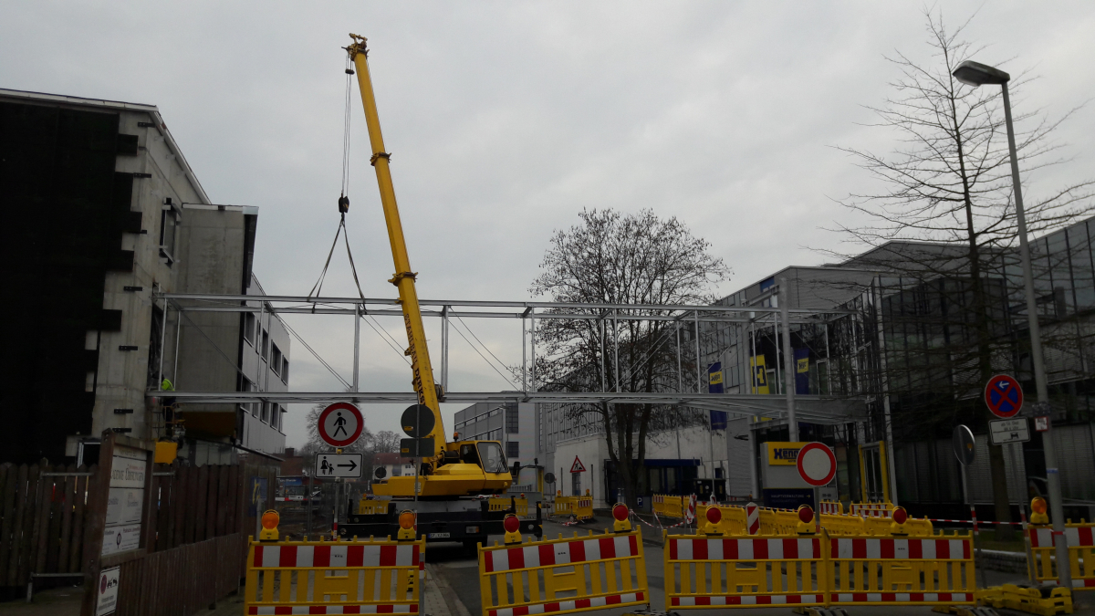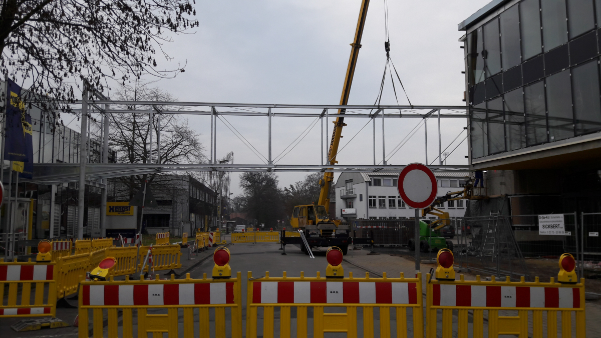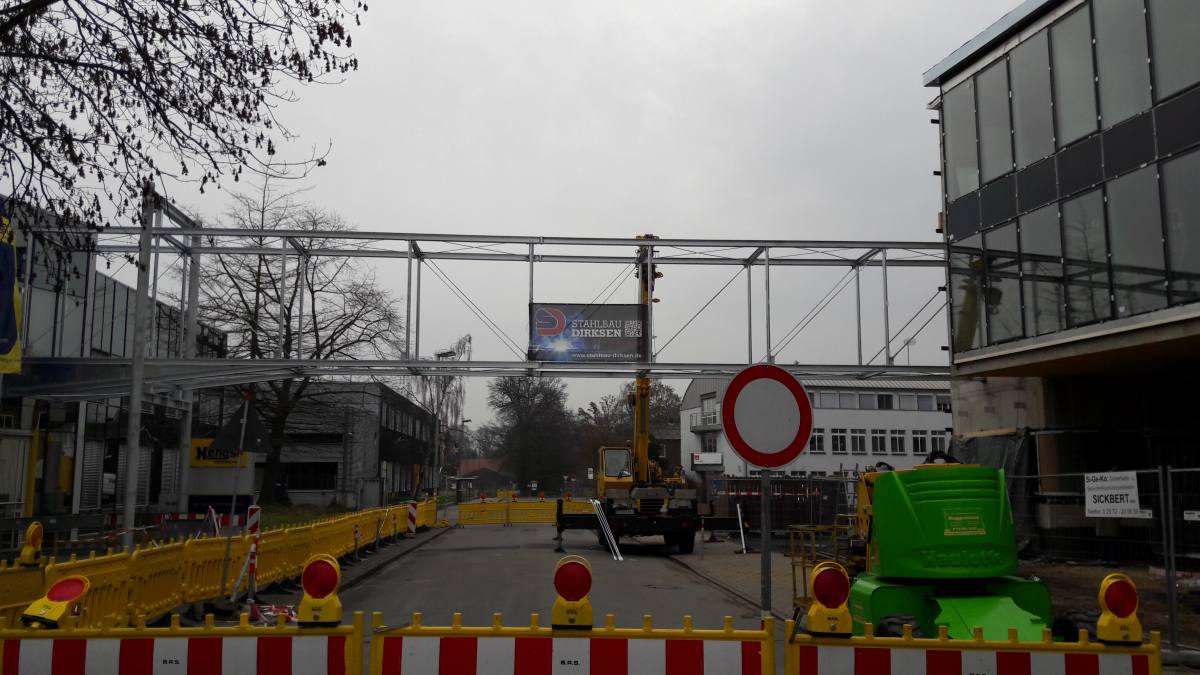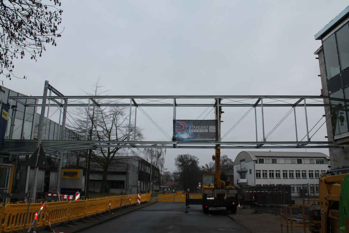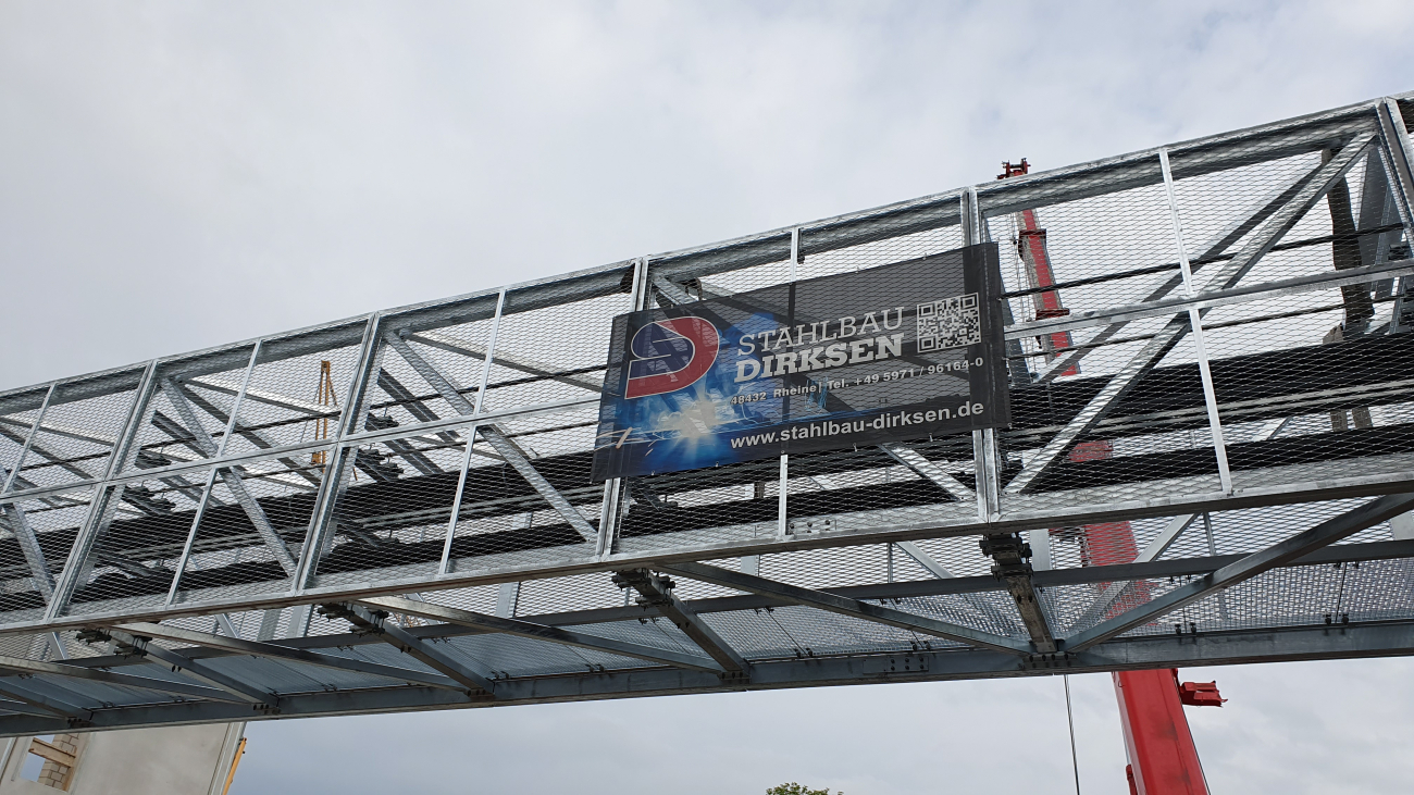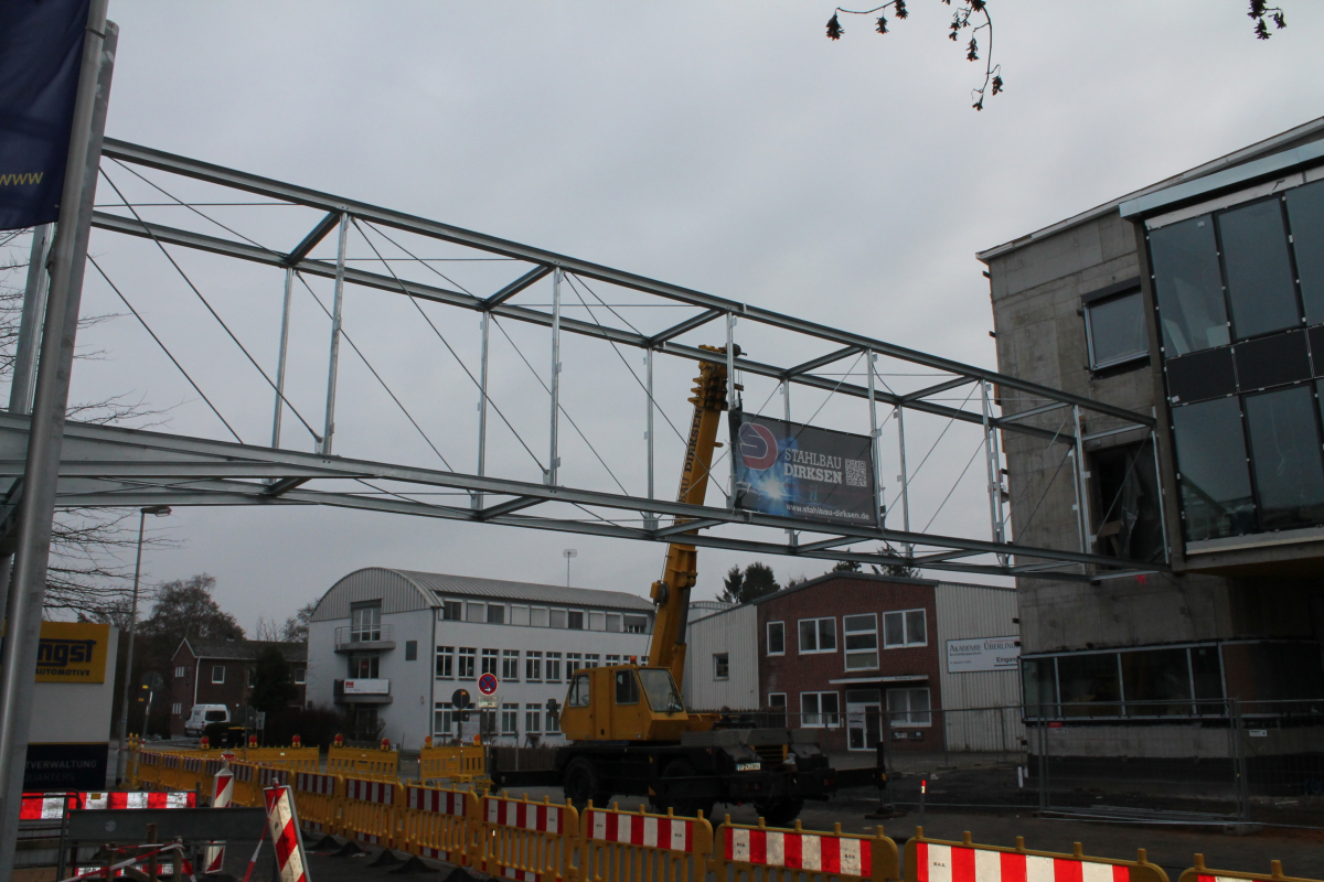 Verbindungsbrücke zwischen 2 Bürogebäuden, frei gespannt über eine öffentliche Straße
