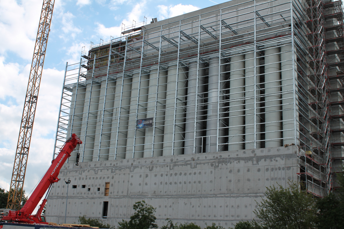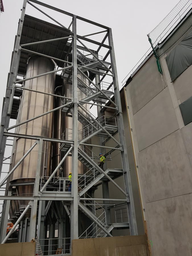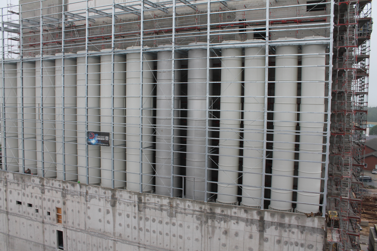 Beauftragt wurden Werk- und Montageplanung, Fertigung, Lieferung und Montage einer Stahlkonstruktion als Einhausung von Silos. Auch der Silotisch, als Unterkonstruktion der Silotanks gehörten zum Leistungsumfang, ebenso eine Treppenanlage im Innen sowie Laufstege und ein Tränenblech-Belag oberhalb der Silos. Alle Stahlkonstruktionsteile wurden feuerverzinkt.
