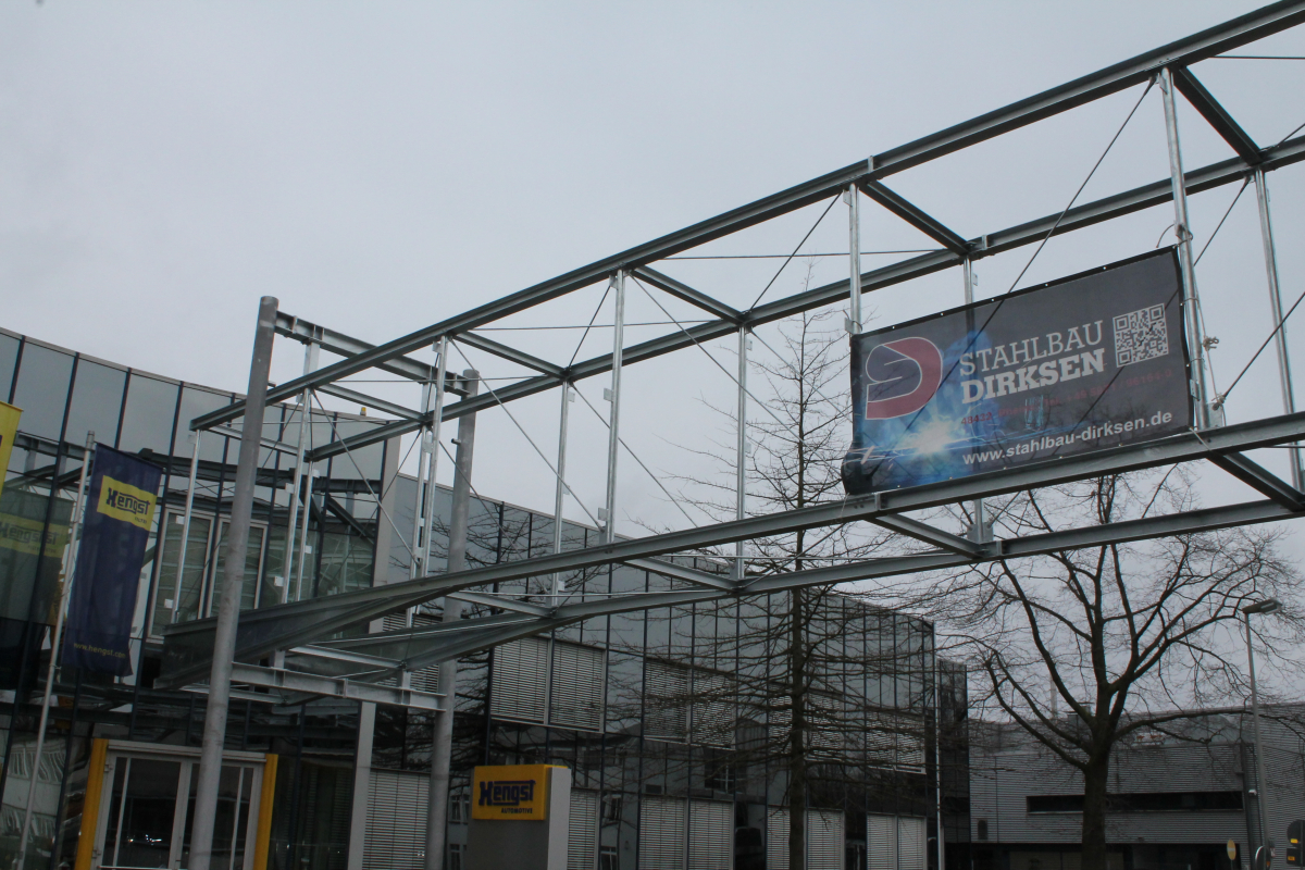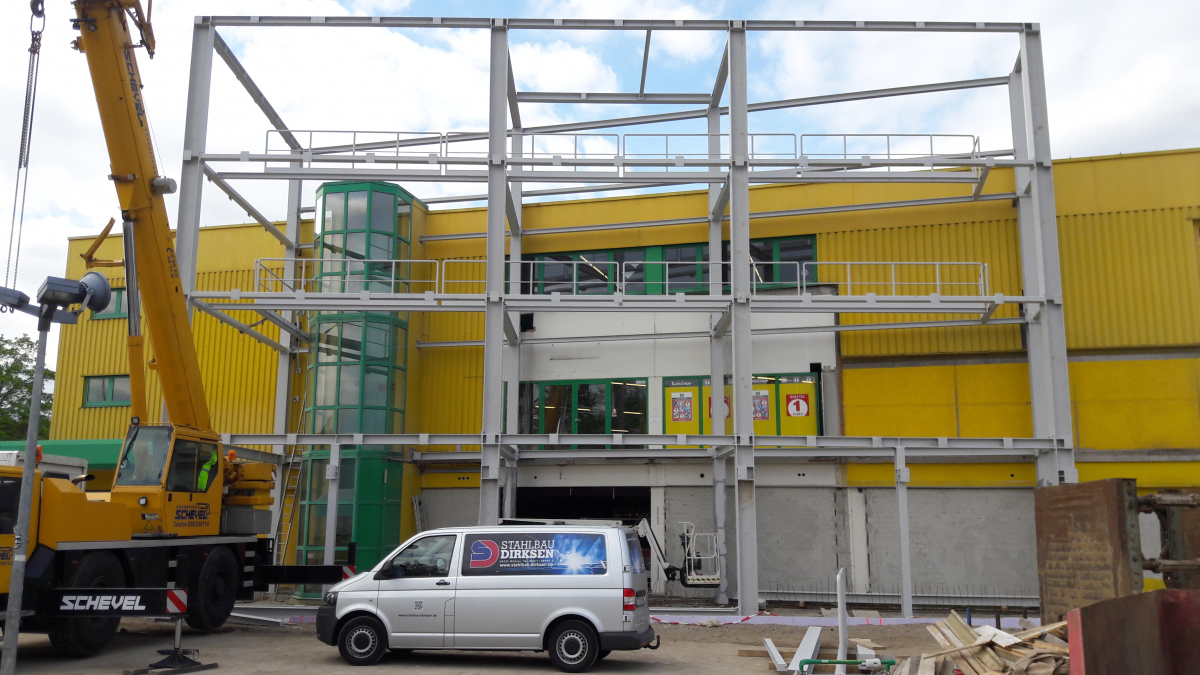 Stahlkonstruktion eines Eingangsbereiches für einen Verbrauchermarkt in beschichteter Ausführung